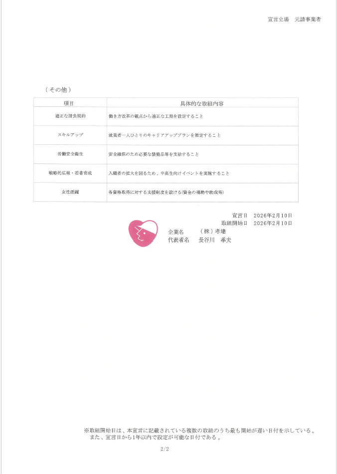 2026.02.10 お知らせ 国土交通省「建設技能者を大切にする企業の自主宣言」の宣言について 株式会社 孝建(代表取締役 長谷川 孝夫)は、「建設技能者を大切にする企業の自主宣言」に登録いたしました。当社は、建設産業の担い手の確保のため、自社技能者の育成等の処理改善に向けて、積極的・持続的に取り組むことを宣言します。