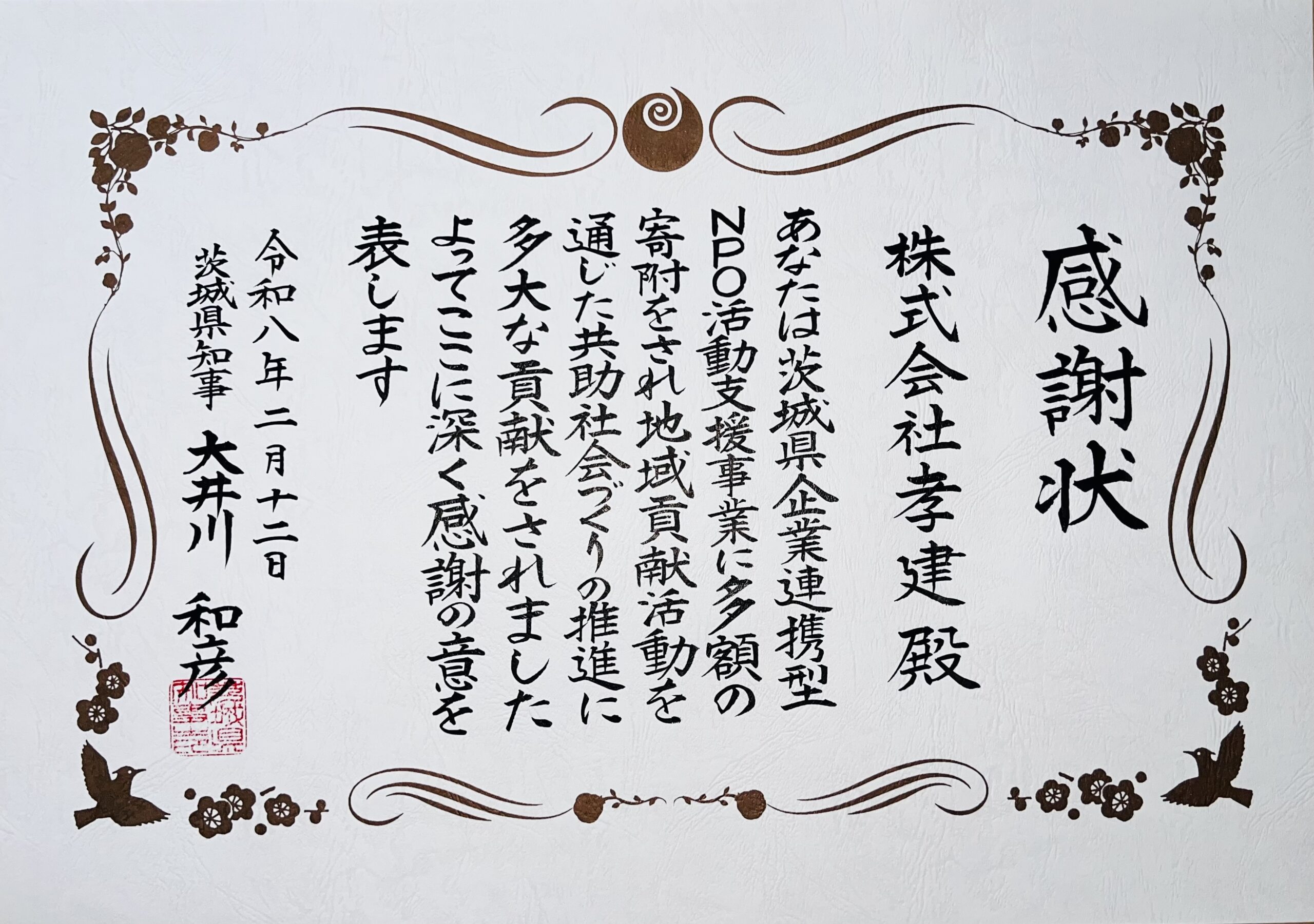 茨城県知事から感謝状を拝受いたしました 株式会社 孝建からのお知らせページです。各種お知らせをご案内しております。茨城県内全域の住宅・倉庫・店舗など様々な建物の解体を承ります。