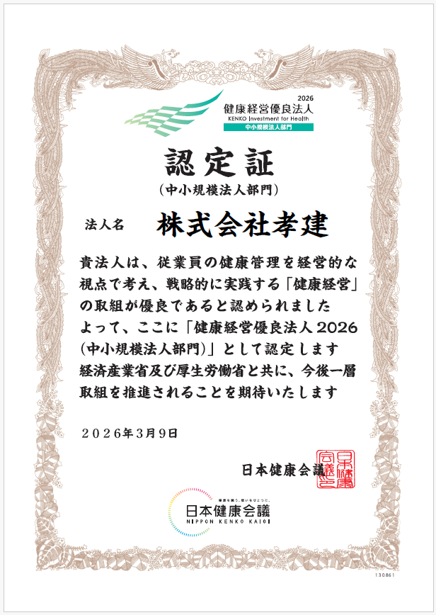 2026.03.09 お知らせ 「健康経営優良法人2026(中小規模法人部門)」に認定されました この度、昨年に引き続き「健康経営優良法人2026(中小規模法人部門)」に認定されました。 今後も会社が従業員の健康維持・増進に積極的に関わり、従業員のパフォーマンス向上を実現することで、より社会の安心・安全に貢献する企業に成長できるよう努めてまいります。